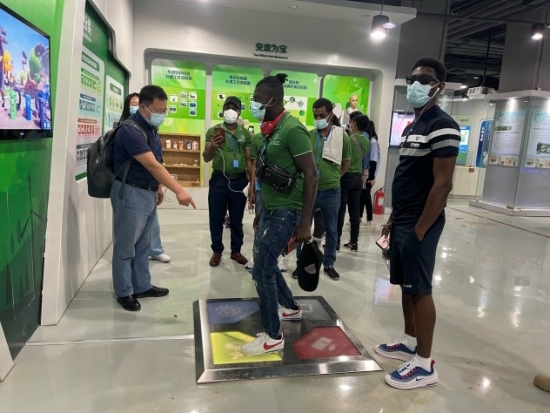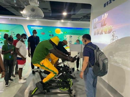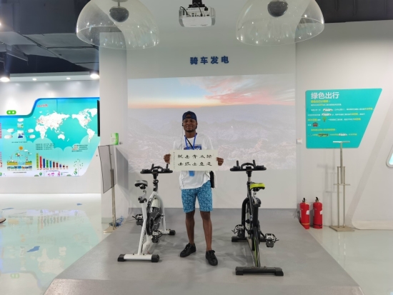 留學(xué)生們還參觀(guān)了綠色生活展廳中水、能源、資源回收利用和有機(jī)農(nóng)業(yè)等展區(qū),通過(guò)現(xiàn)場(chǎng)講解、觀(guān)看影片等方式,學(xué)習(xí)相關(guān)的生態(tài)環(huán)境科普知識(shí),積極參與體驗(yàn)騎車(chē)發(fā)電、垃圾分類(lèi)挑戰(zhàn)臺(tái)等生態(tài)環(huán)境保護(hù)互動(dòng)設(shè)施。