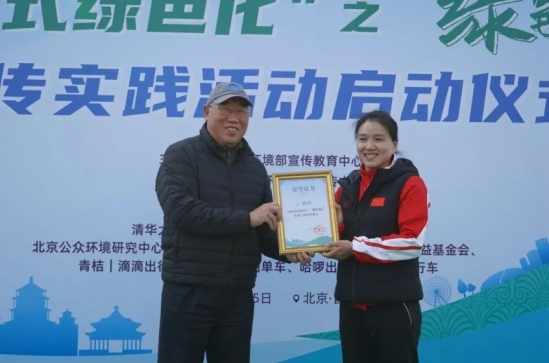 啟動(dòng)儀式上,解振華顧問(wèn)向活動(dòng)大使——中國(guó)女子自行車隊(duì)運(yùn)動(dòng)員、2016里約奧運(yùn)會(huì)中國(guó)國(guó)家自行車隊(duì)成員之一、奧運(yùn)冠軍宮金杰頒發(fā)證書(shū)。隨后,來(lái)自環(huán)保社會(huì)組織、企業(yè)、媒體、高校和市民等各界代表共計(jì)約100人參加了騎行體驗(yàn)活動(dòng),并組成了五支騎行隊(duì)伍全程體驗(yàn)自行車專用路。